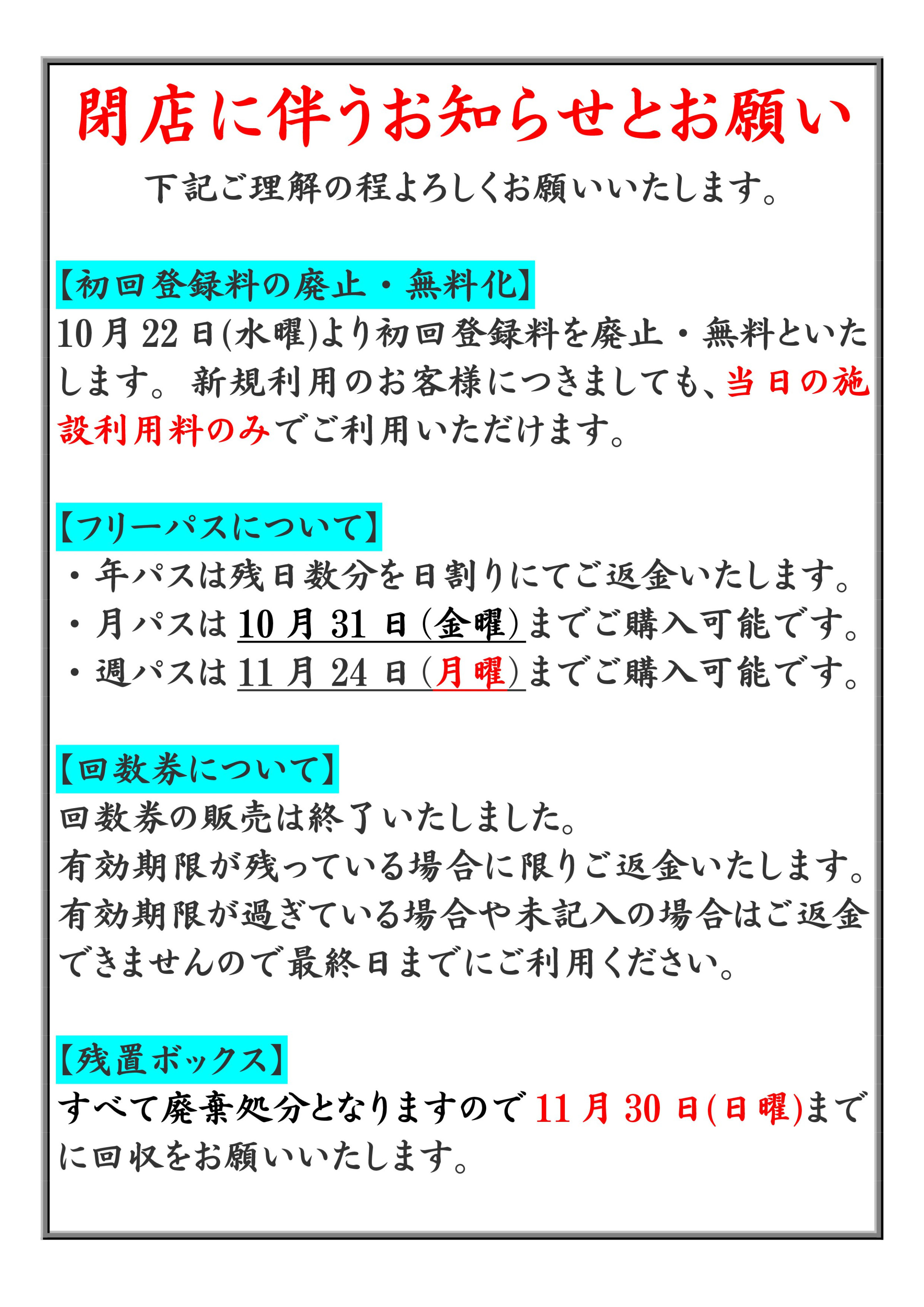| 設備・サービス | 冷暖房 更衣室 休憩室 トイレ、手洗い、足洗い場 無料インターネット接続 |